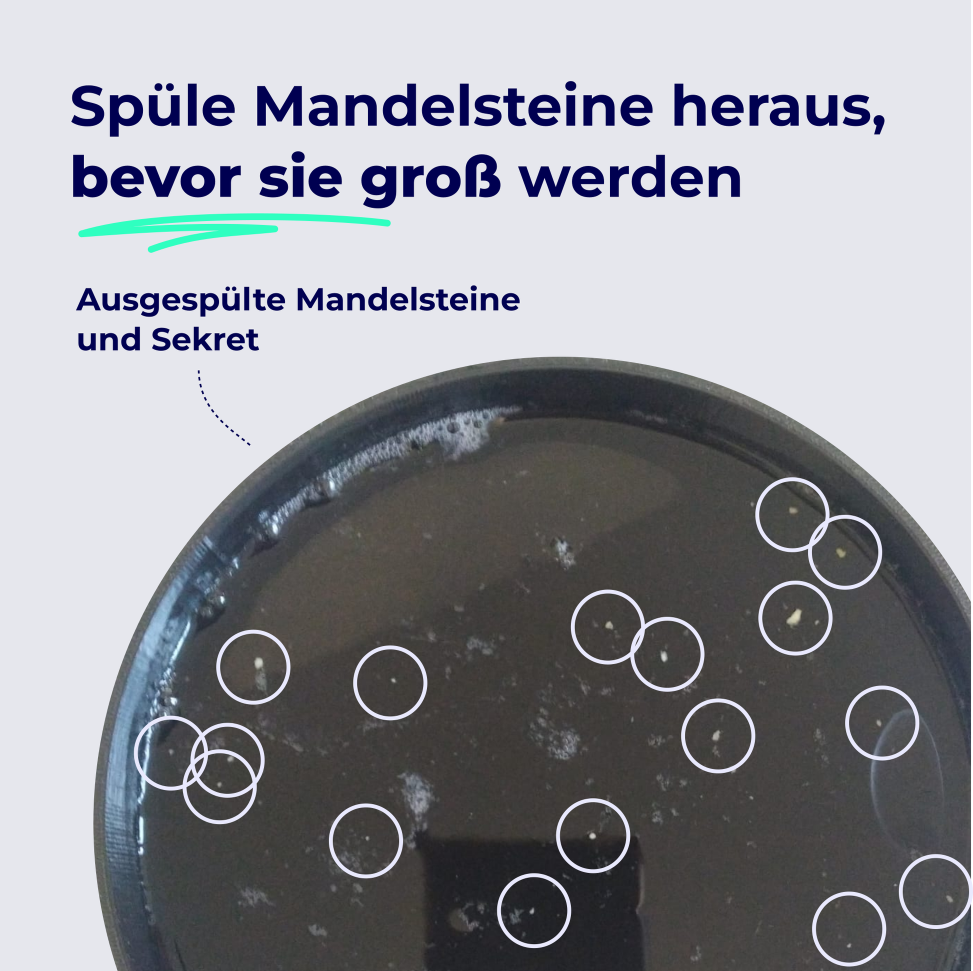 | Mandelsteine heraussaugen: Drücke den tonsi zusammen und setze die Pipette auf die Einziehungen (Krypten) deiner Mandel, in welcher ein Mandelstein festsitzt. Löse den Druck langsam, sodass ein leichter Sog entsteht, der Mandelsteine und Schmutz heraussaugt. |
