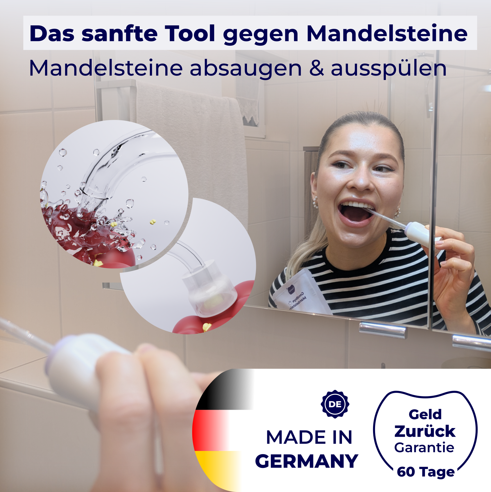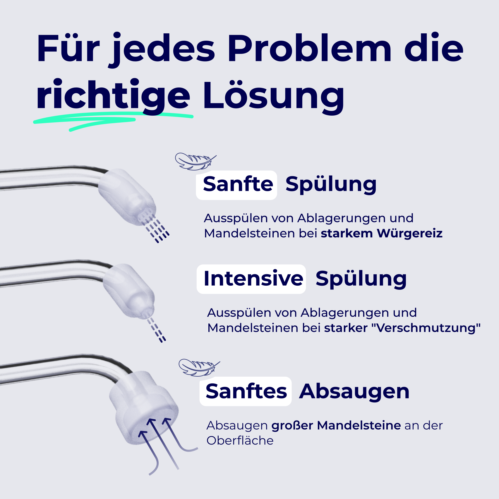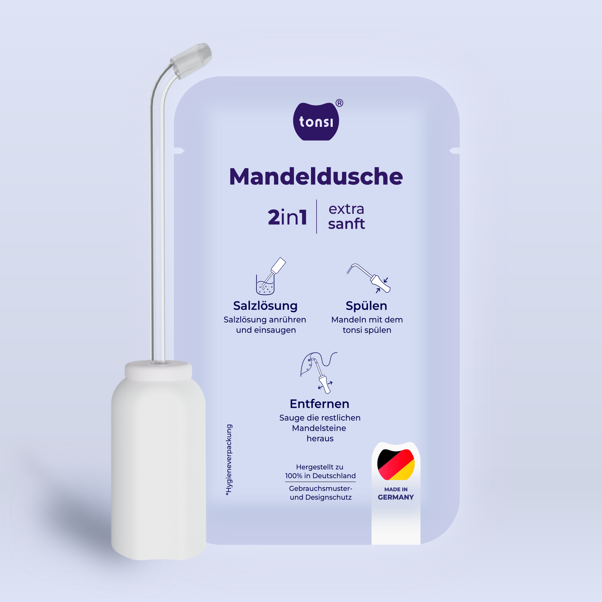 Intuitiv in der Handhabung: Einfache Bedienung für die regelmäßige Anwendung. Effektiv in der Anwendung: Spült deine Mandeln und saugt Mandelsteine heraus. Einzigartig im Design: Unser tonsi ist tageslichttauglich und muss nicht versteckt werden.
