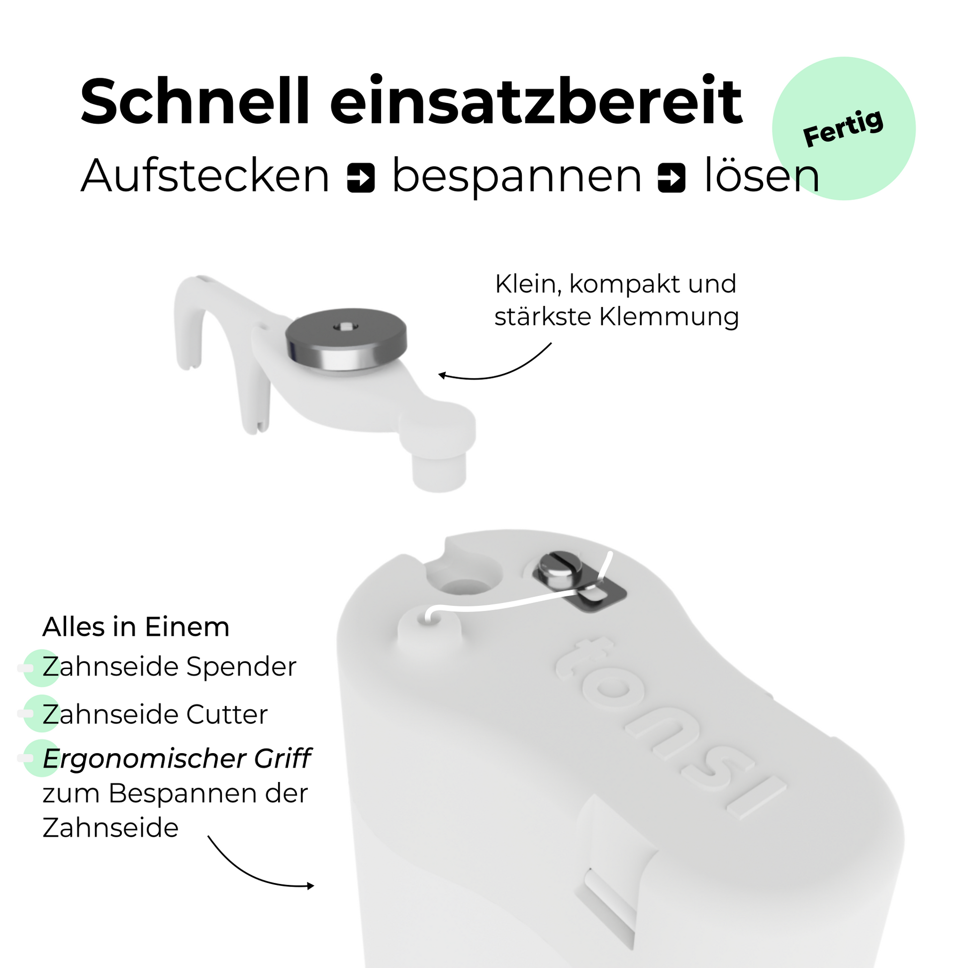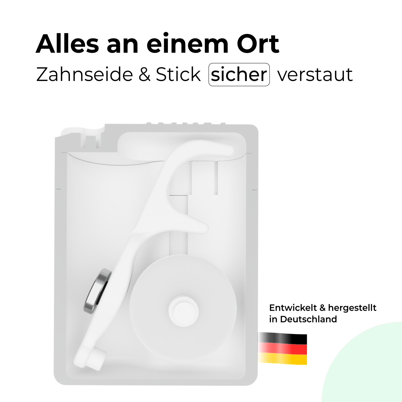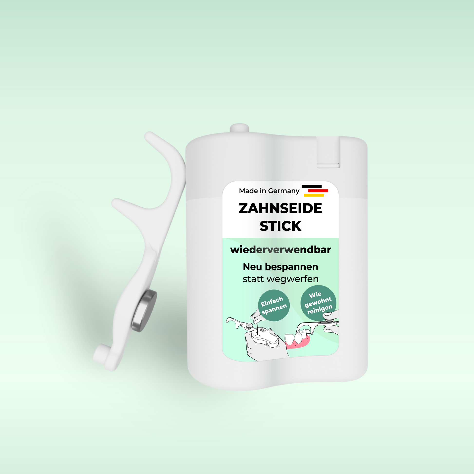 Unser Versprechen an euch ist, dass wir nur die besten Materialien für unser Zahnseide-Set verwenden. Denn wir möchten eine Lösung bieten, die sicher, hygienisch, langlebig, einfach und effizient ist.