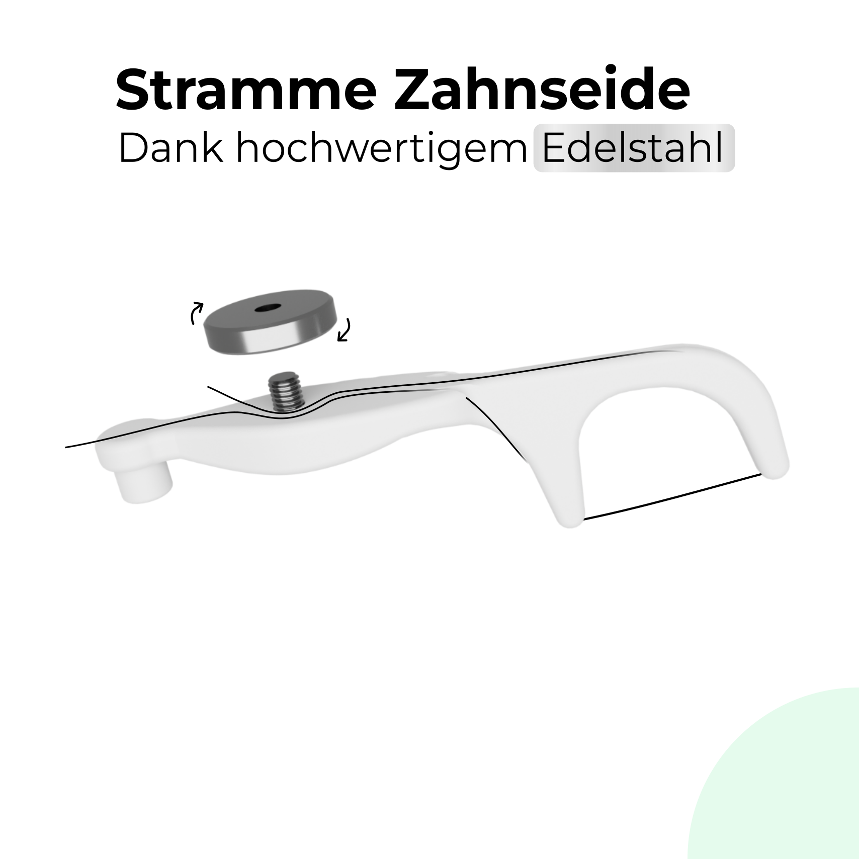 - Edelstahl ist langlebig: Alle Komponenten, die entweder Zahnseide klemmen oder abschneiden bestehen aus Edelstahl. Edelstahl ist super langlebig und schneidet Zahnseide über Jahre hinweg mit gleichbleibendem Erfolg.